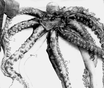 На фото: Содержимое желудка кашалота в Антарктике: 1- антарктические клыкачи;2 - антарктический глубоководный кальмар;3 - кальмары семейства онихотейтид